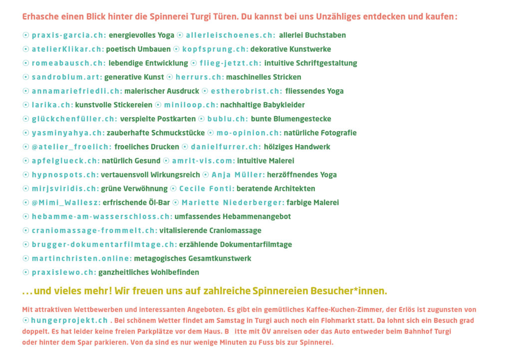 Über 30 Labels und ich freuen uns sehr über einen Besuch in der alten Spinnerei. Es gibt bei mir eine Tombola, bei anderen Labels Rabatte und im Haus eine Kafi-Kuchen-Stube. Kommt vorbei, es lohnt sich!