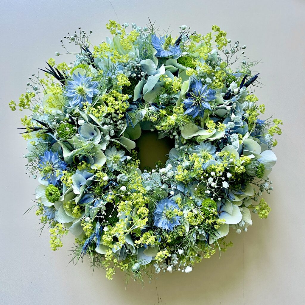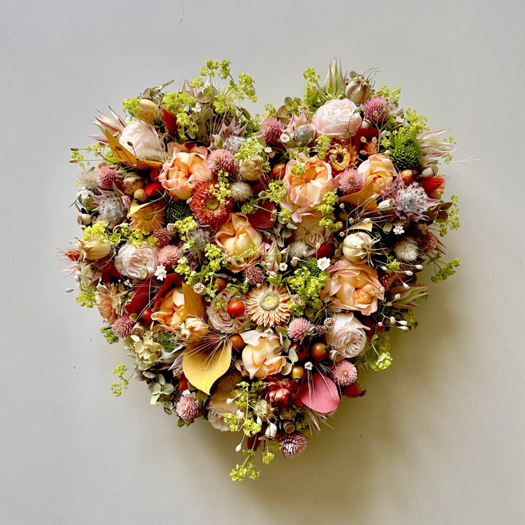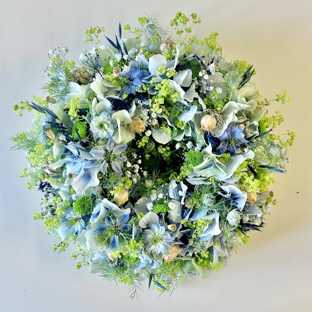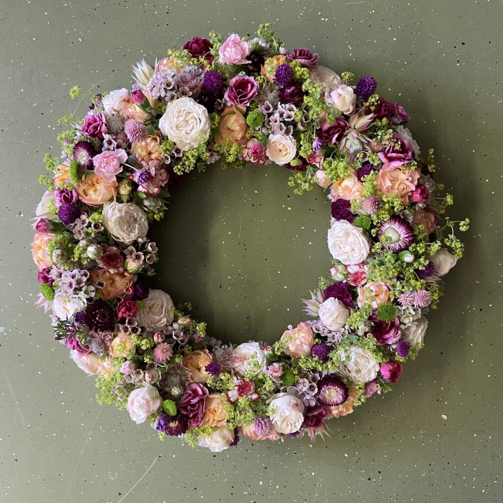 Die erste Blumenlieferung aus Holland von Musketierblumen ist angekommen und im Atelier sind daraus erste Kränze entstanden. Sie sind so gesteckt, dass sie auch noch schön aussehen, wenn sie trocken sind, weil es bunte Trockenblumen dabei hat.