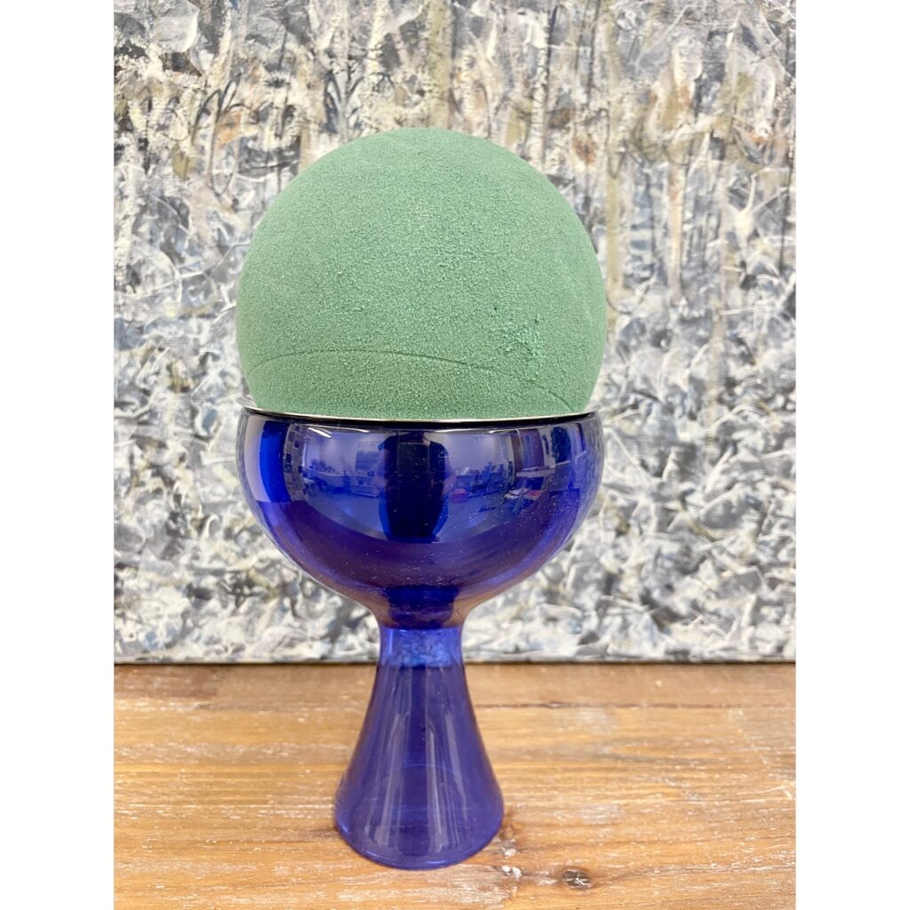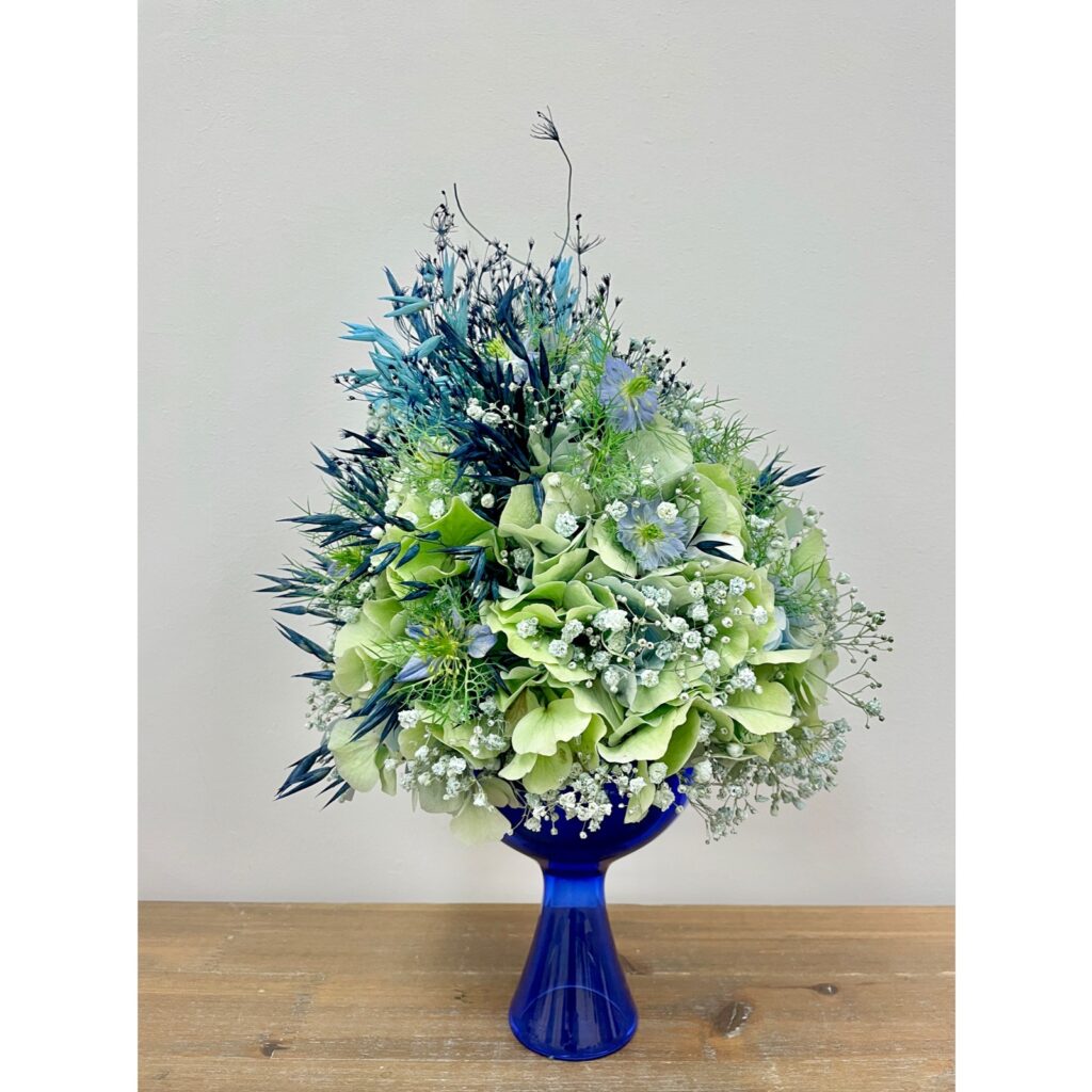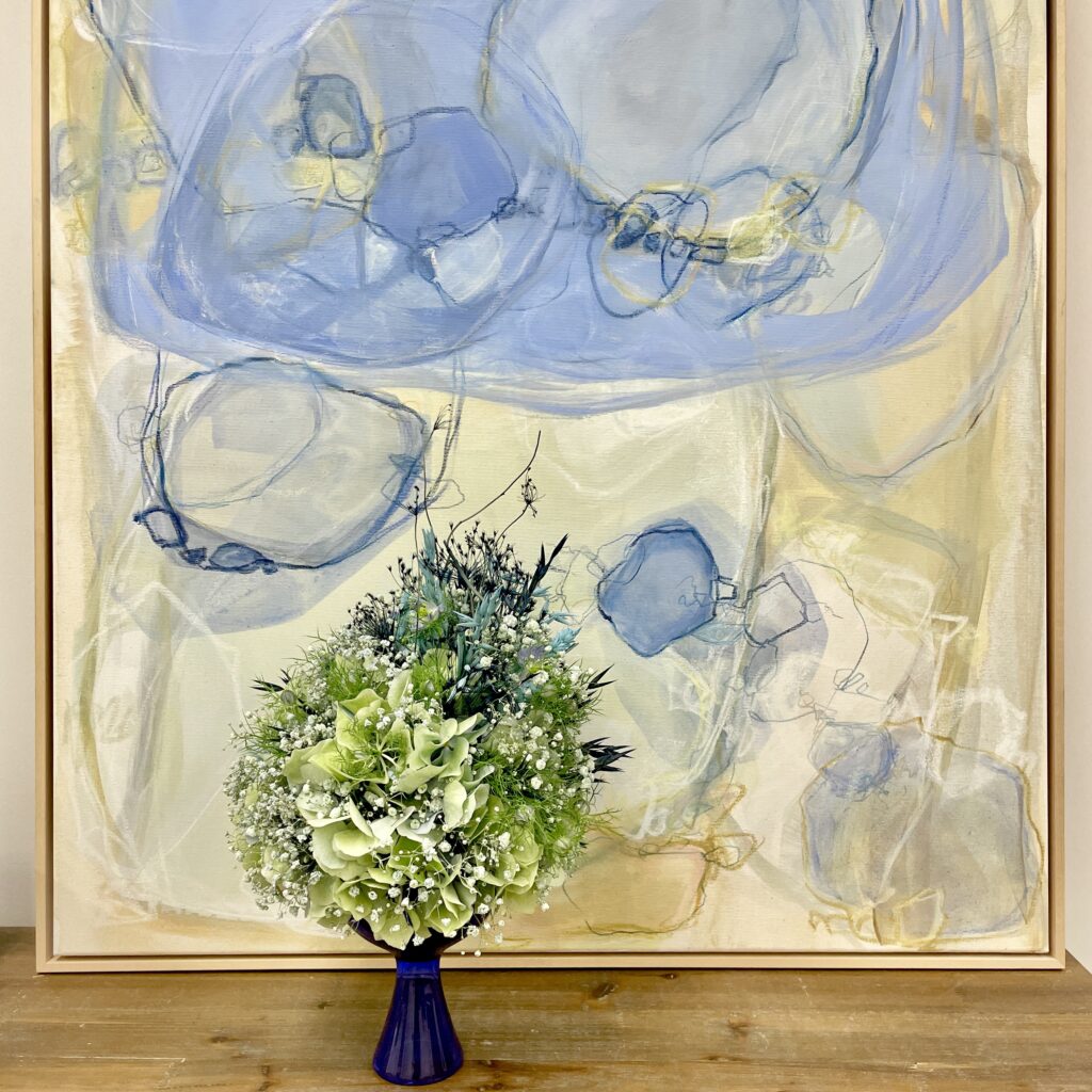 Das blau-weiße Blumengesteck passt farblich perfekt zu zwei meiner Kunstwerken. Ich habe Hortensien, Jungfer im Grünen, Schleierkraut und gefärbte Trockenblumen auf einer Steckschaum-Kugel platziert. Der blaue Kelch ist ein 70er Jahre Coupe-Glas aus dem Brocki.